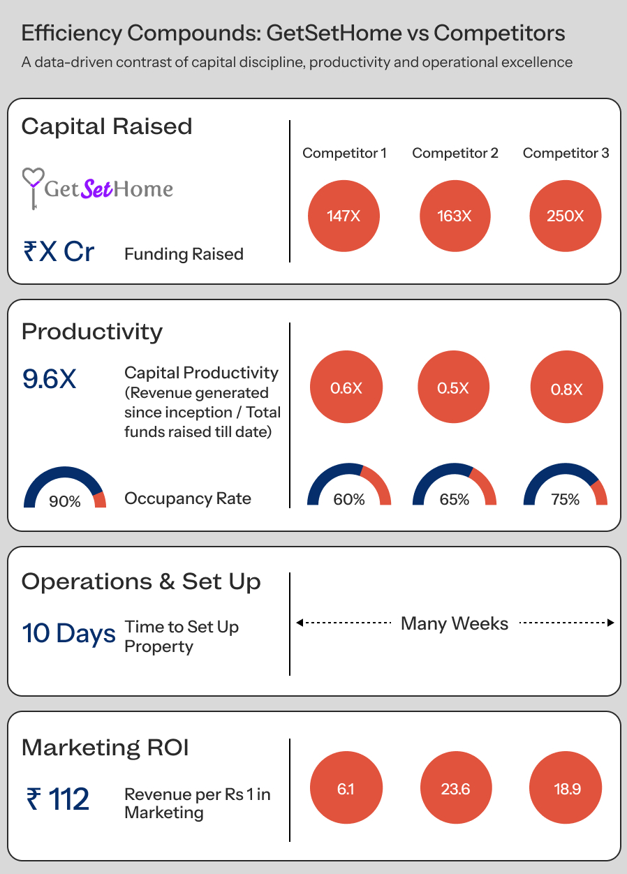 What stood out to us back then—and continues to compound today—is how, while funded peers chased scale with significant burn, GSH quietly built a strong, sustainable business. An average revenue run rate of ₹195 million, over 90% occupancy, and gross margins of around 35%.